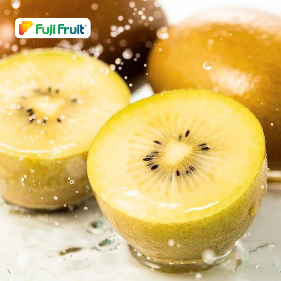 Kiwi vàng là giống kiwi lai tạo, có hình dạng quả giống với kiwi xanh nhưng không có nhiều lông xù xì như kiwi xanh. Vỏ có màu nâu vàng trơn nhẵn, thịt quả màu vàng trong rất đẹp mắt, với nhiều hạt đen tạo thành 1 vòng tròn xung quanh trục dọc của quả. Kiwi vàng có vị ngọt mát rất đặc trưng.